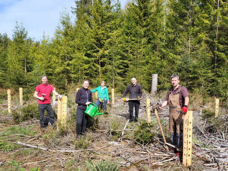 Warum wir als Paletten- und Kistenprofis selbst im Matsch stehen? Ganz einfach: Wer täglich mit dem besten Werkstoff der Welt arbeitet, muss auch dafür sorgen, dass er nachwächst. Während in unserer Produktion normalerweise die Sägen laufen, haben wir heute mal die Rollen getauscht und sind zu „Baum-Eltern“ geworden.